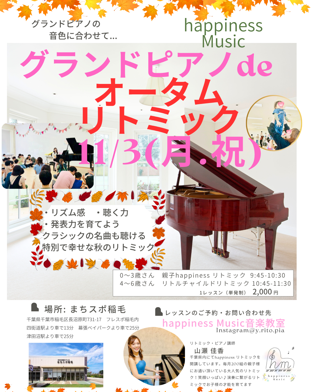 グランドピアノde秋リトミック🍂を開催します!!10月3日(月㊗️)まちスポ稲毛@稲毛 幕張 四街道 津田沼 幕張ベイパーク リトミック・ピアノ